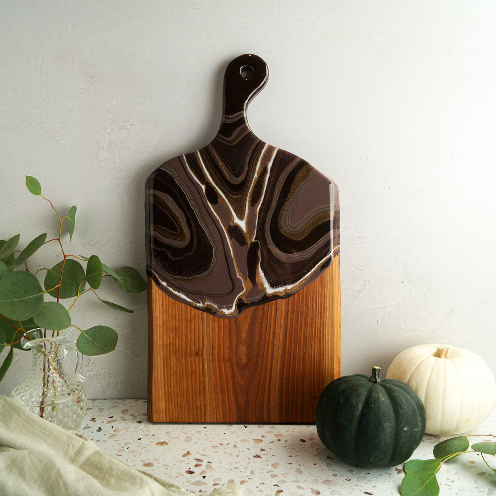 This resin serving board is rich, indulgent, and utterly cozy. Hot Chocolate brings the warmth of autumn to your table. Deep, chocolatey resin swirls across the natural wood, evoking the comforting richness of a steaming mug of cocoa on a crisp fall evening.
