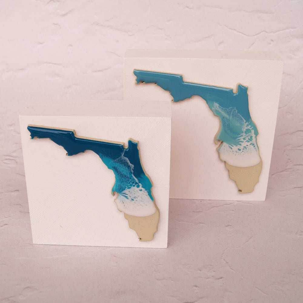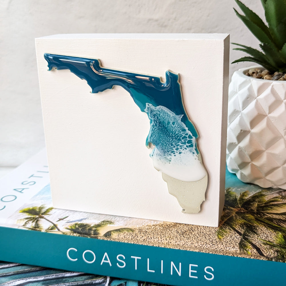 Bring the beauty of Florida's pristine beaches into your home with this stunning small resin artwork. Perfectly sized to fit on a bookshelf or hang on your wall, this handcrafted piece captures the essence of sunlit shores and rolling waves.