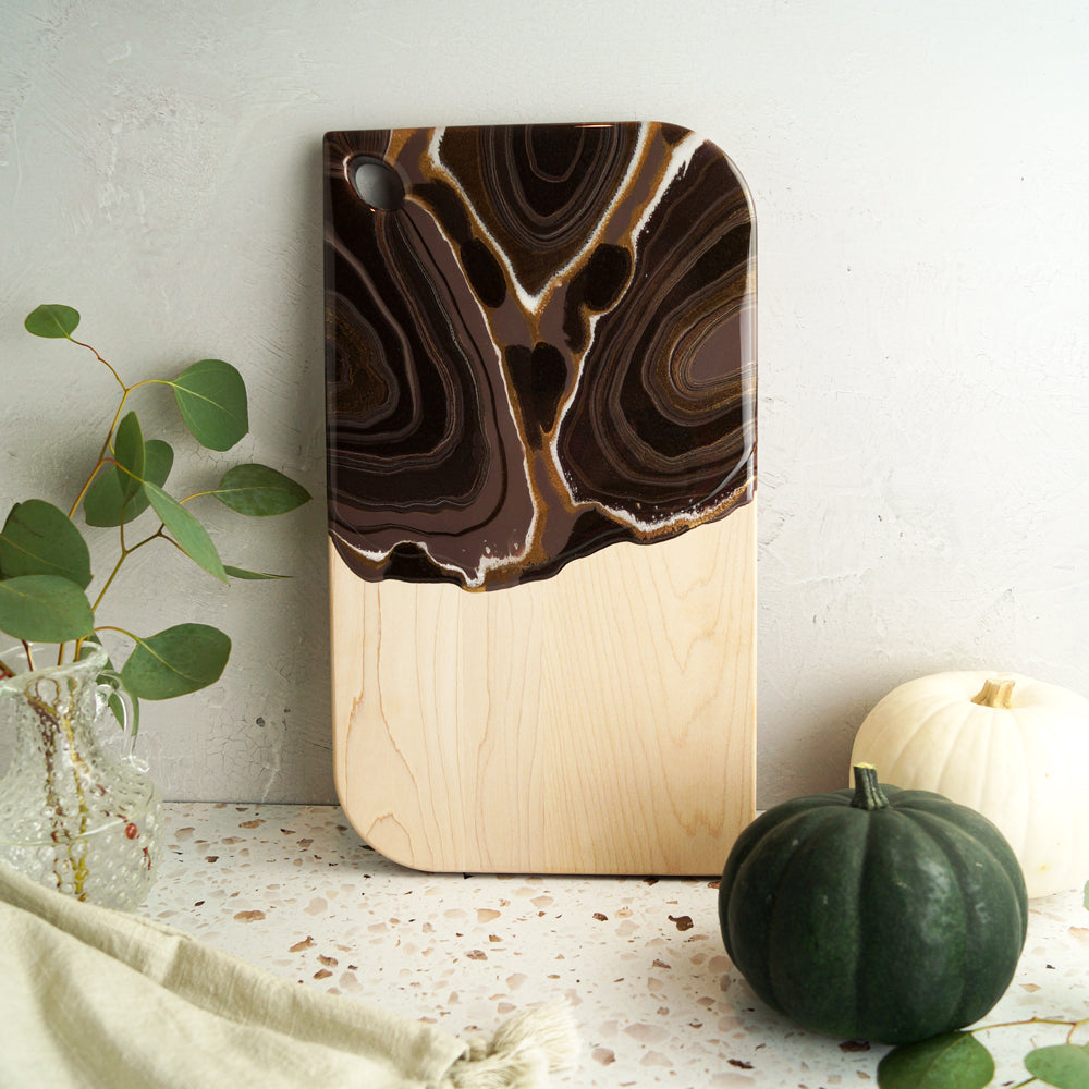 This resin serving board is rich, indulgent, and utterly cozy. Hot Chocolate brings the warmth of autumn to your table. Deep, chocolatey resin swirls across the natural wood, evoking the comforting richness of a steaming mug of cocoa on a crisp fall evening.