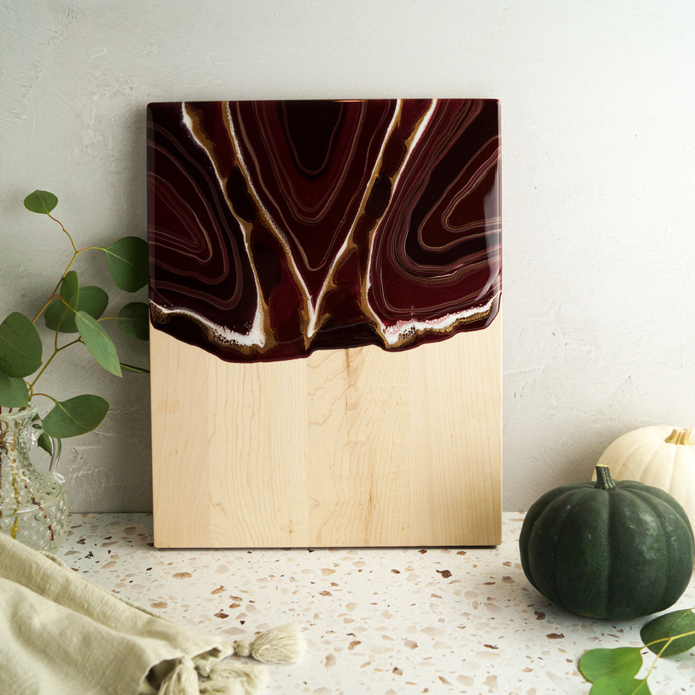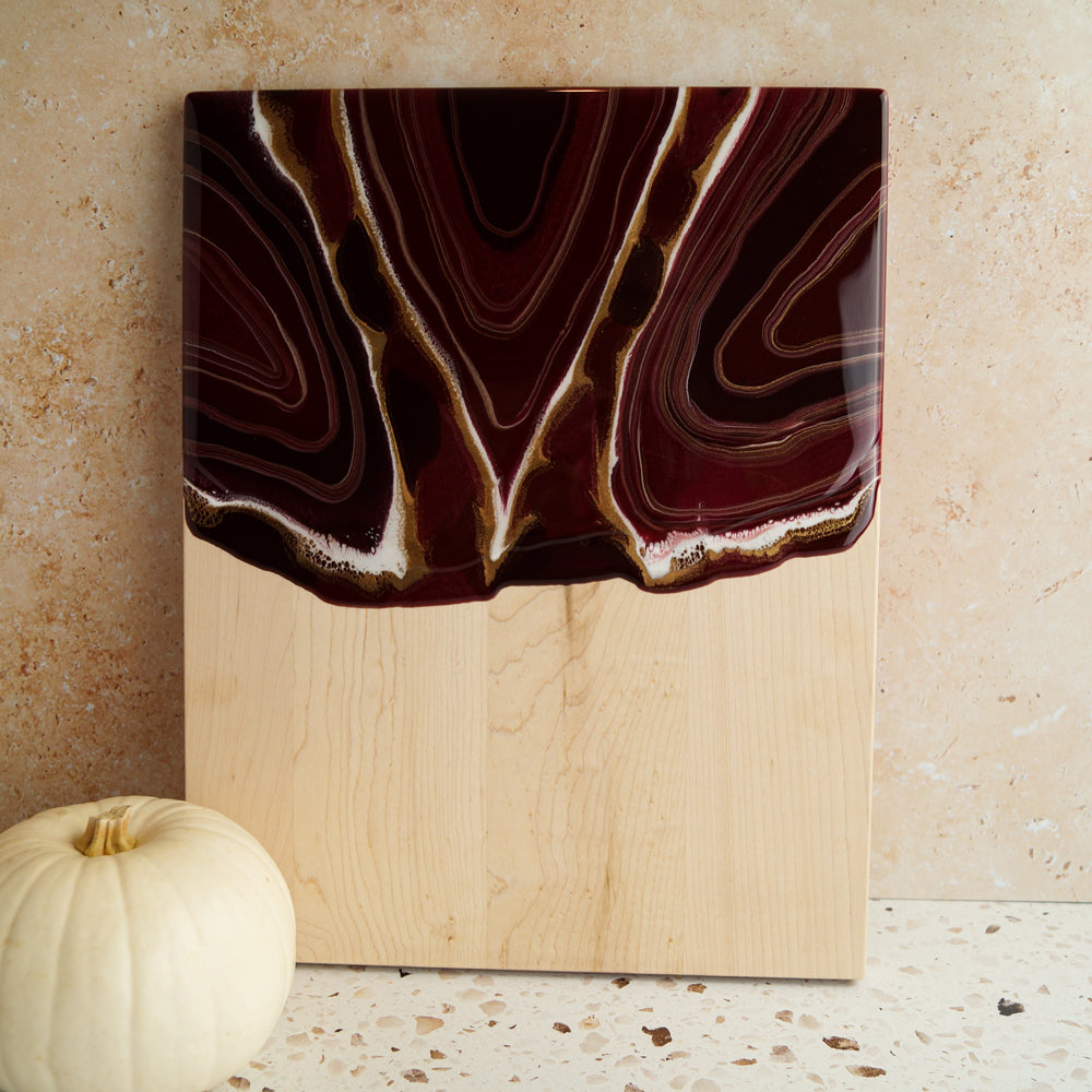 This serving board is rich, warm, and inviting. Mulled Wine features a deep, wine-colored resin that swirls across the natural wood grain, reminiscent of cozy autumn evenings and glasses of spiced red by the fire.