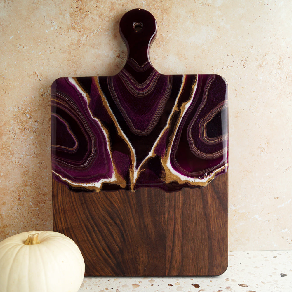 This serving board is rich and luxurious. Fireside Fig captures the essence of fall’s darker, moodier moments. The saturated plum resin flows across the natural wood grain, evoking late-season fruits, cozy evenings, and the elegance of autumn in full swing.