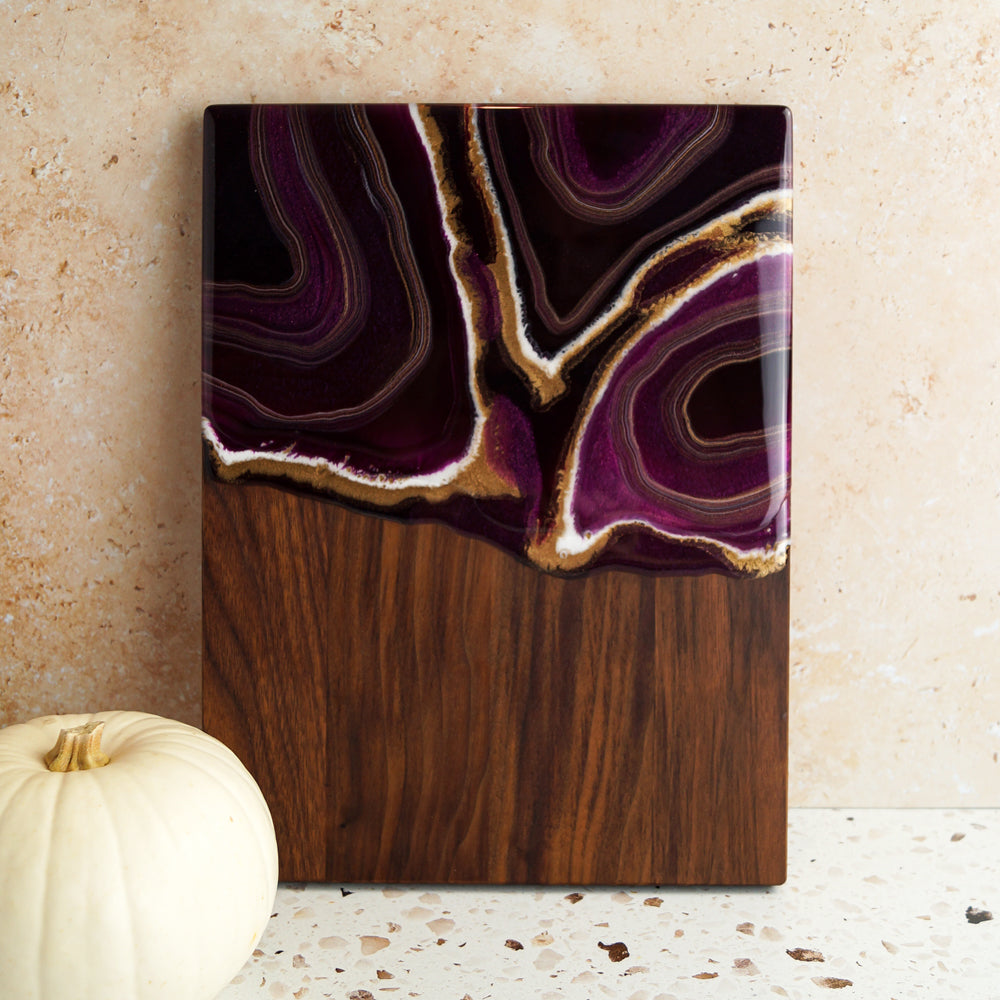 This serving board is rich and luxurious. Fireside Fig captures the essence of fall’s darker, moodier moments. The saturated plum resin flows across the natural wood grain, evoking late-season fruits, cozy evenings, and the elegance of autumn in full swing.
